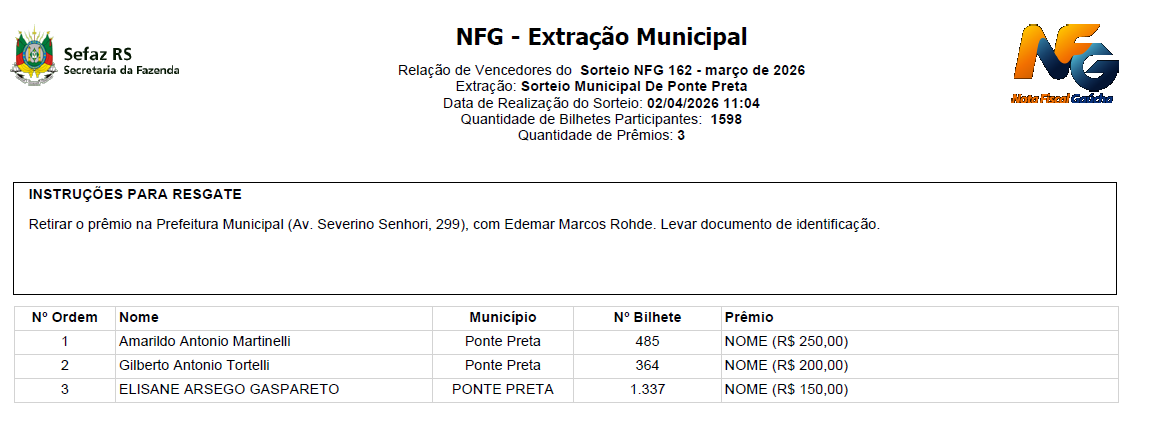 Confira os ganhadores da NOTA FISCAL GAÚCHA do mês de MARÇO/2026 Foram três ganhadores que compraram no comércio e foram beneficiados com o convênio firmado...