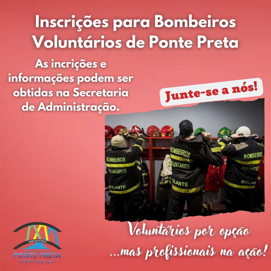 Estão aberta as inscrições para os bombeiros voluntários de Ponte Preta. Para informações e inscrições, procurar a Secretaria Municipal de Administração.