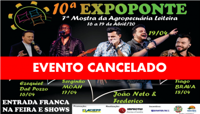 A Prefeitura Municipal de Ponte Preta, a Associação Comercial Industrial e Empresarial de Ponte Preta/RS, o Poder Legislativo, Impactus Feiras e Eventos e a Comissão Organizadora da 10ª EXPOPONTE, que seria realizada entre os dias 16 a 19 de abril de 2020, comunicam que a mesma está CANCELADA, por conta do coronavírus, seguindo protocolos emitidos pela Organização Mundial de Saúde, pelo Ministério da Saúde, Governo do Estado do Rio Grande do Sul e decisão tomada em conjunto com a Associação dos Municípios do Alto Uruguai - AMAU.