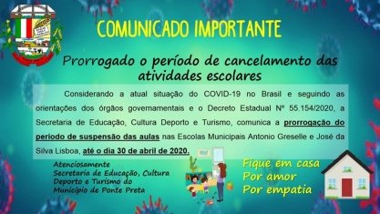 Prorrogação do cancelamento das aulas nas Escolas Municipais.