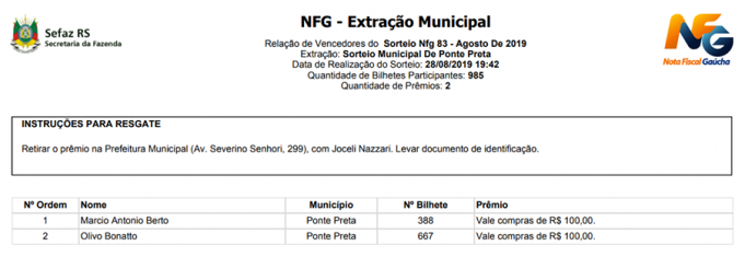 Ganhadores da Nota Fiscal Gaúcha Sorteio Municipal de Ponte Preta, de agosto de 2019.
