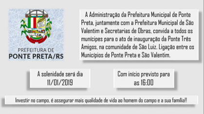 A Administração da Prefeitura Municipal de Ponte Preta, juntamente com a Prefeitura Municipal de São Valentim e Secretarias de Obras, convida a todos os munícipes para o ato de inauguração da Ponte Três Amigos, na comunidade de São Luiz. Ligação entre os Municípios de Ponte Preta e São Valentim.