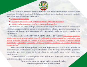 Com o aumento crescente de casos da Covid-19, a Administração Municipal de Ponte Preta, através da Secretaria Municipal de Saúde, ressalta a importância de manter os cuidados para evitar a proliferação do vírus, como: