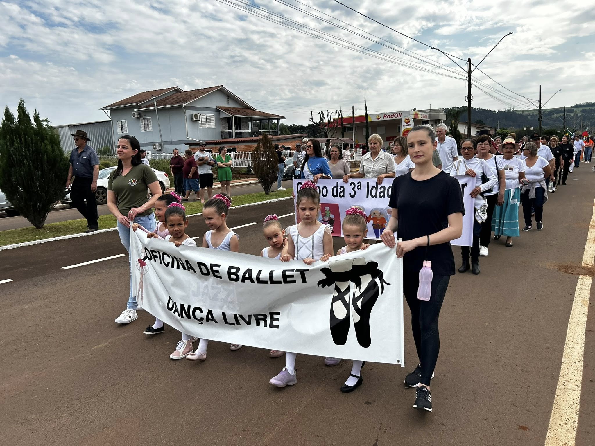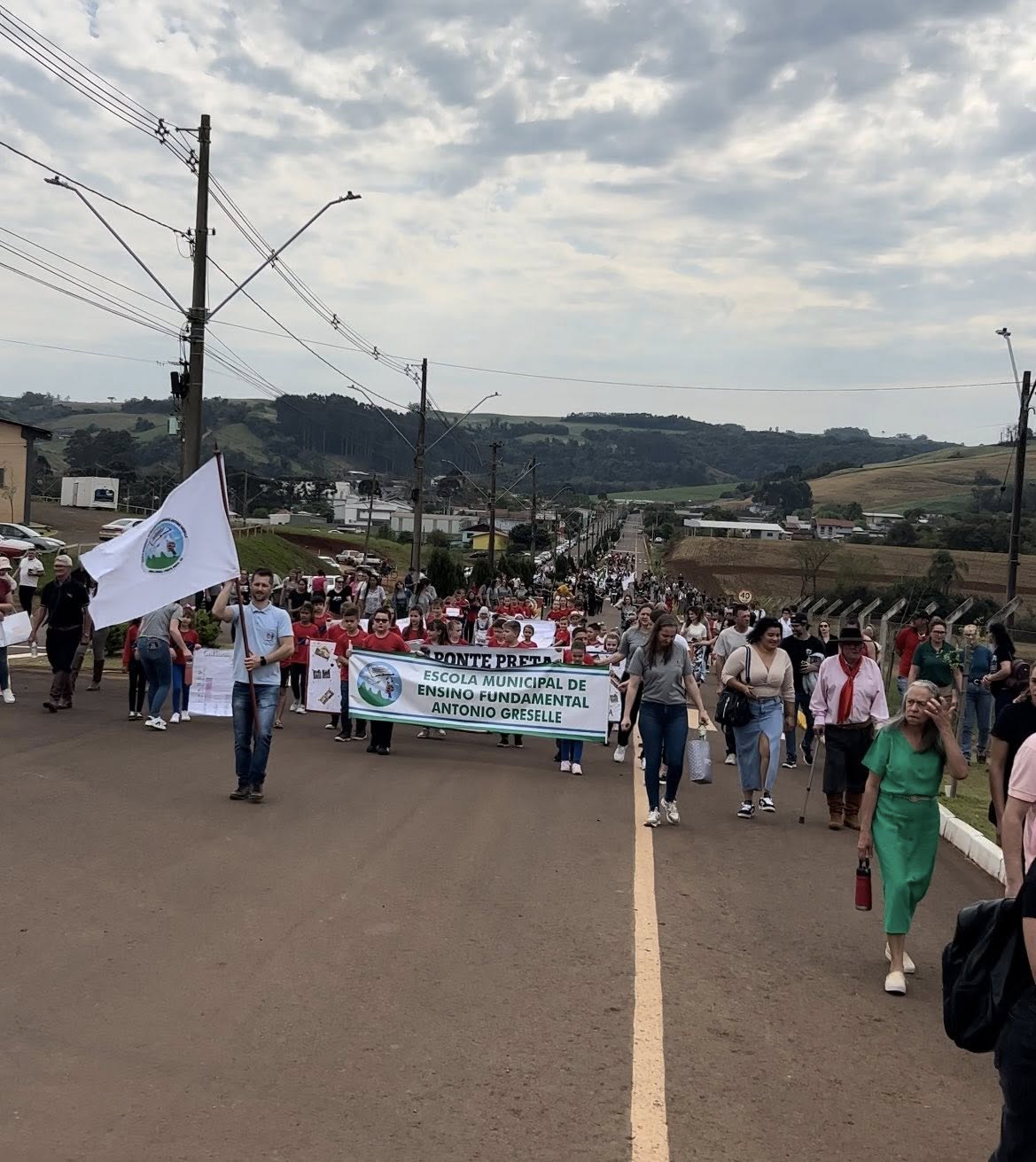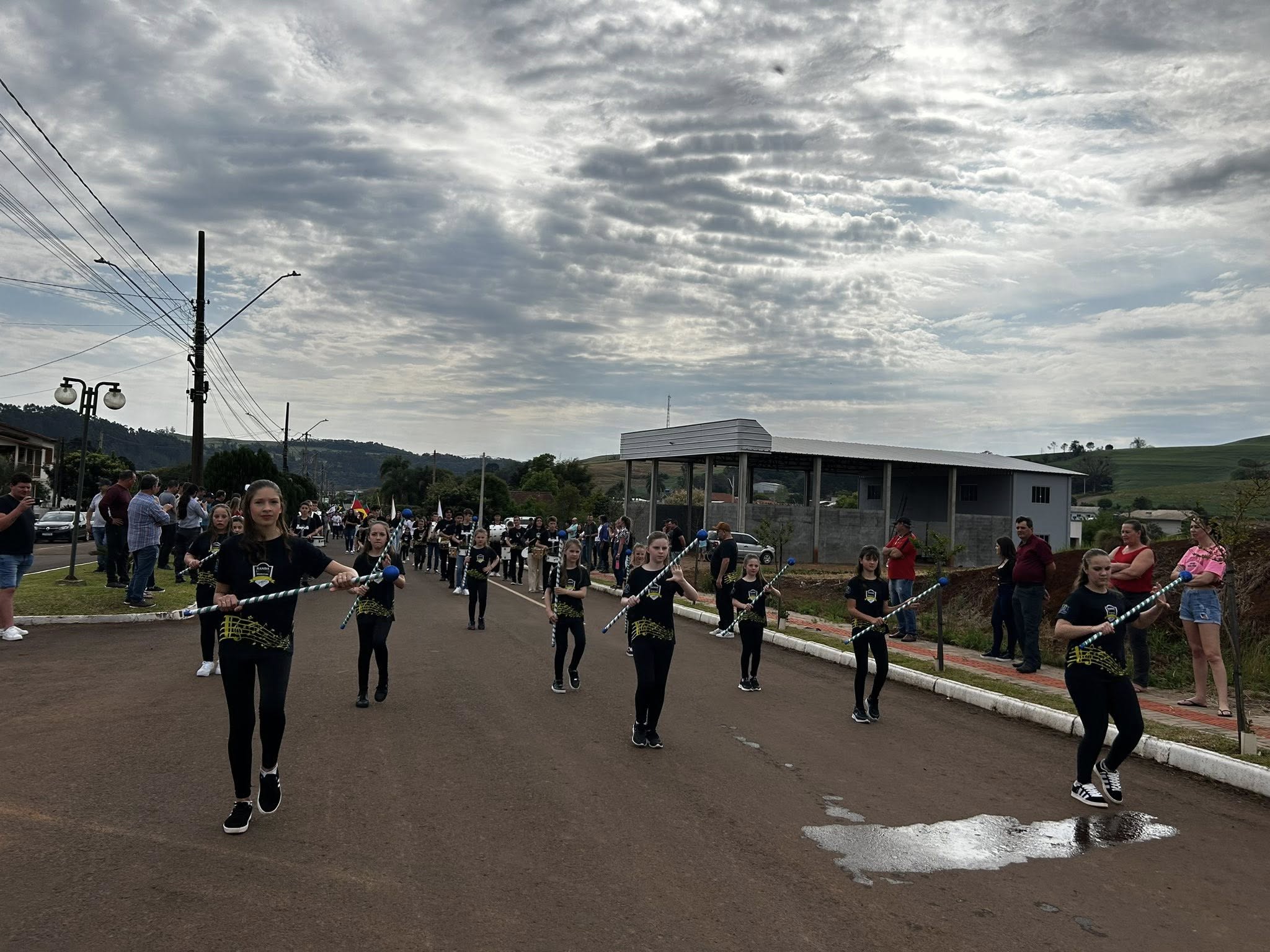 Após o desfile cívico e tradicionalista, a Banda Municipal de Ponte Preta encantou o público com apresentações especiais, seguidas pelas escolas, que levaram criatividade, cultura e homenagens à história do Rio Grande do Sul.